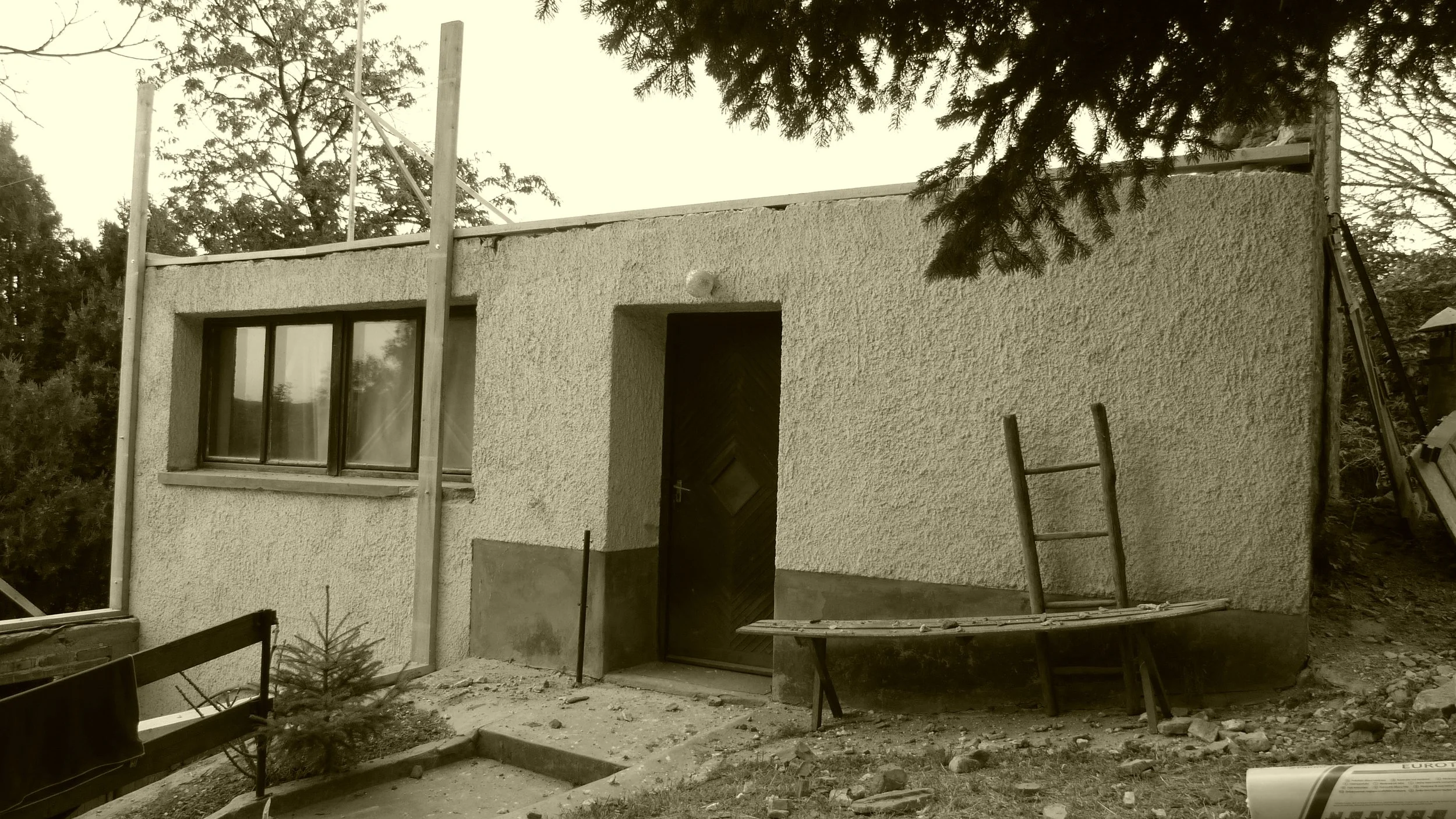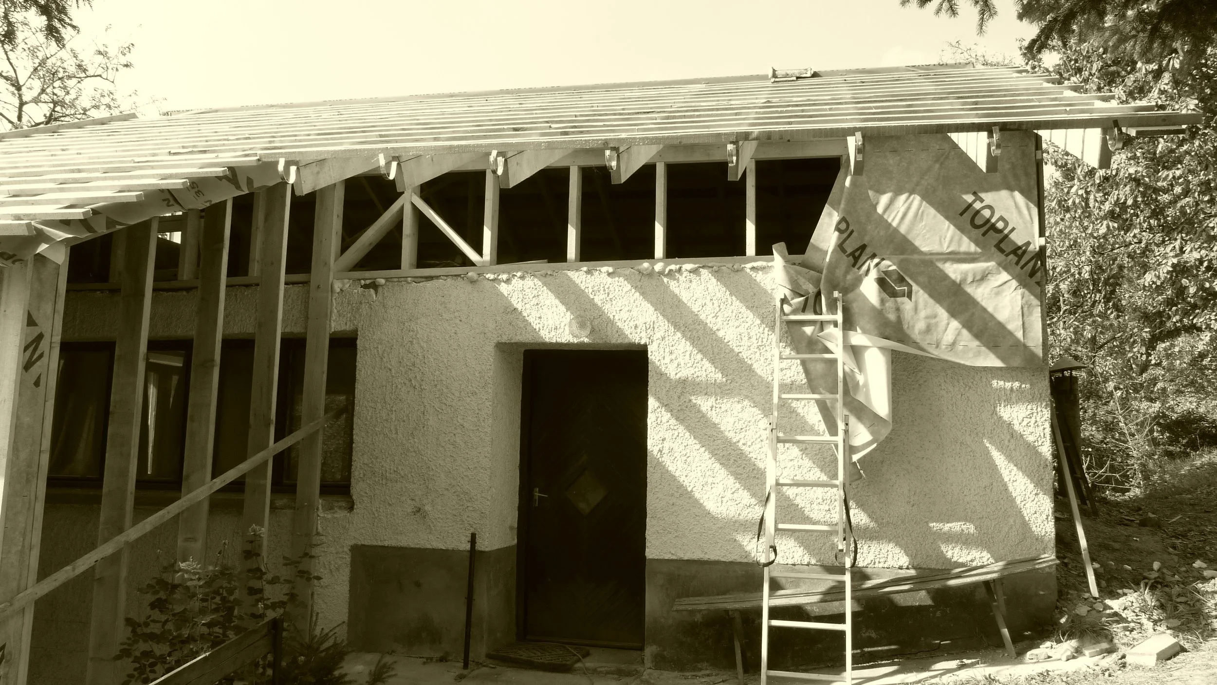 Amikor elegünk lett a nagyvárosi taposómalomból, arra az elhatározásra jutottunk feleségemmel, hogy keresünk magunknak egy csendes, elszigetelt kis otthont, ahová életvitelszerűen elvonulhatunk. Minden hétvégén beültünk a kocsiba és útnak indultunk. Bejártuk a Mátrát, Börzsönyt, Pilist, Gerecsét, Vértest, a Bakonyt, végül egy év után egy zalai falu szőlőhegyén kötöttünk ki egy másfél hektáros birtokon, melyen 2 présház állt. A telek több, mint felén erdő terült el U alakban körbe ölelve a két házikót és a köztük található gyümölcsöst. Belevágtunk az egyik bazaltkőből rakott présház felújításába, ami 18 m2 volt, ezért hozzá toldottunk még egy fürdőszobányi építményt (kb. 8 m2-t). A hozzáépítés és az új tető is skandináv technológiával épült, vázszerkezetként csakis pallófát használtunk (5x15cm). A távolág és megfelelő szakember-hiány miatt lassan haladtunk, hárman építettük egy helybéli profi ács segítségével, aki jártas volt ebben a technológiában.